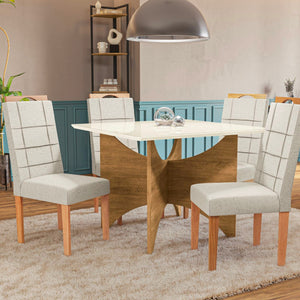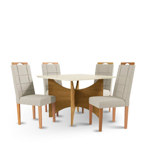 Juego de comedor moderno, que combina una cubierta más clásica con una base más jugada. Buen tamaño para sentar 6 personas cómodamente.