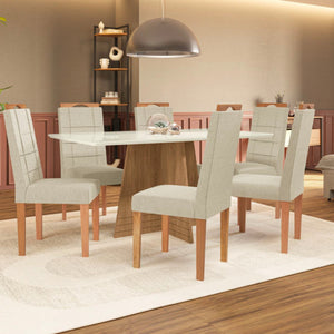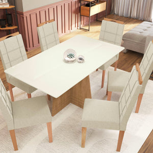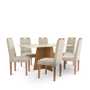 Juego de comedor moderno, que combina una cubierta más clásica con una base más jugada de cortes rectos con detalles calados. Buen tamaño para sentar 6 personas cómodamente.