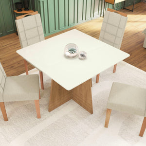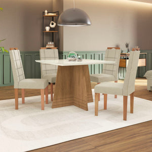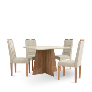Juego de comedor moderno, que combina una cubierta más clásica con una base más jugada. Buen tamaño para sentar 6 personas cómodamente.