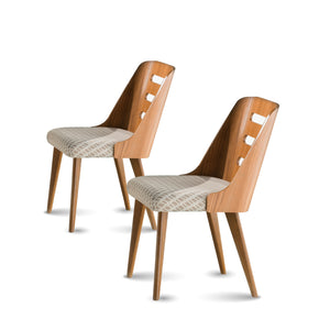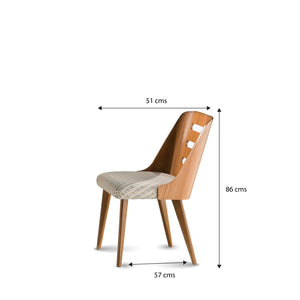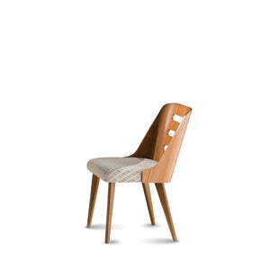 Silla de líneas modernas, con calado en el respaldo. Su tapiz de color neutro, combina a la perfección con diferentes tonos de mesas.