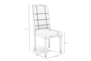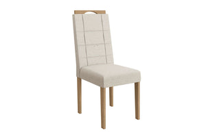 Silla de líneas modernas con respaldo alto en madera natural. Su tapiz de color crudo, combina a la perfección con diferentes tonos de mesas.