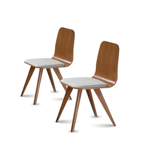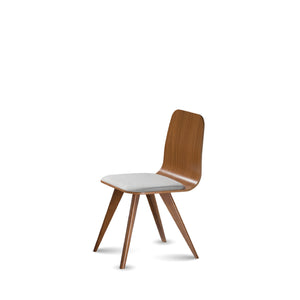 Silla de líneas simples y modernas, con respaldo fijo de madera y acolchado en el asiento. Su tapiz de color neutro, combina a la perfección con diferentes tonos de mesas.